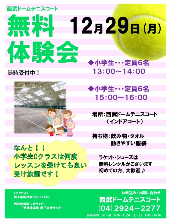 こんにちは!綿引です。 12/29(月)に小学生クラスの無料体験会を開催します。 西武ドームテニスコートではシューズとラケットのレンタルが無料です。もちろん入会後も無料で貸出致します。さ...