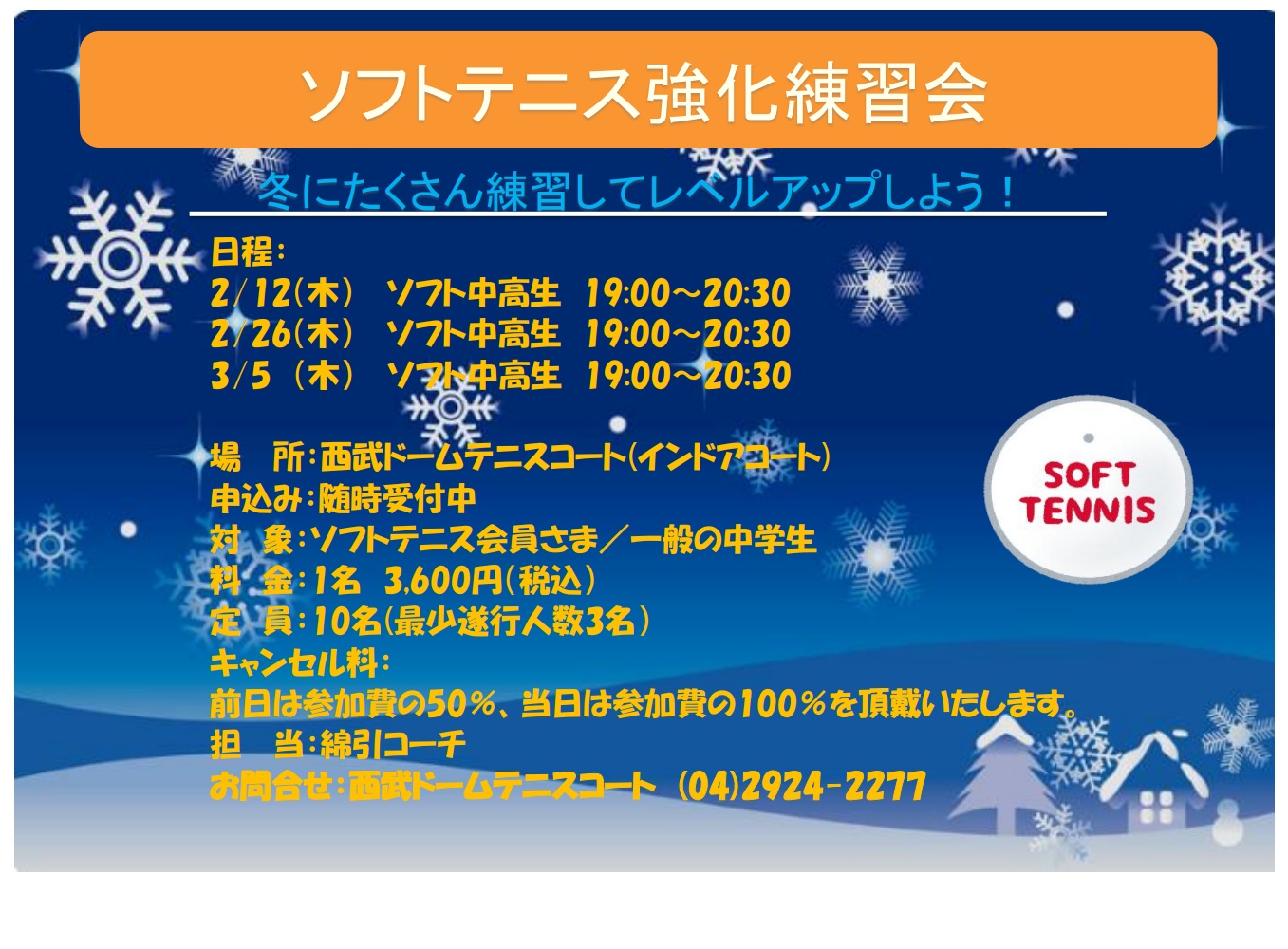 こんにちは!綿引です。 最近は中学3年生が高校合格を聞きちょっと安心しています。高校でもソフトテニスを続ける生徒も多く嬉しく思います。今後も活躍出来るようにサポートさせて頂きます。 2月...