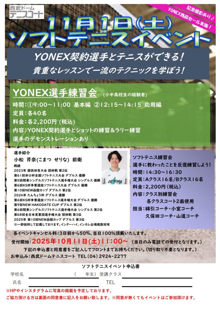 こんにちは! 西武ドームテニスコートです。 今年もYONEX の選手によるイベントを開催いたします。今回は小松選手にレッスンして頂きます。前衛の動きや考え方や狙い方など教えて頂きたいと思います。イベントでは選手のショットを近くで観ることが出来、... -