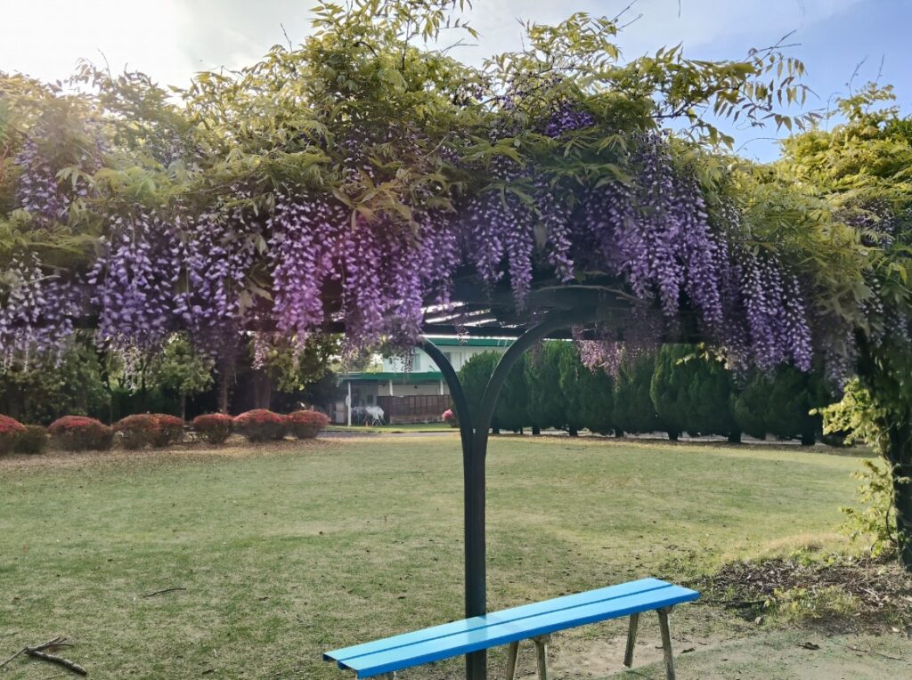 《注意》藤棚の周りに、花の蜜を求めて蜂が飛んでいます。藤棚に近づくときには蜂を刺激しないようご注意ください(^-^;