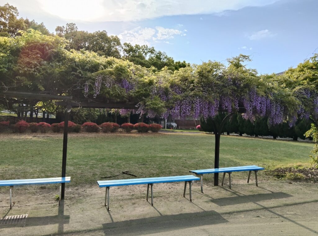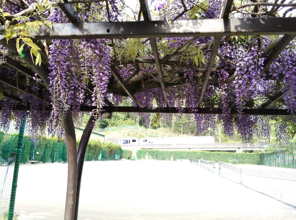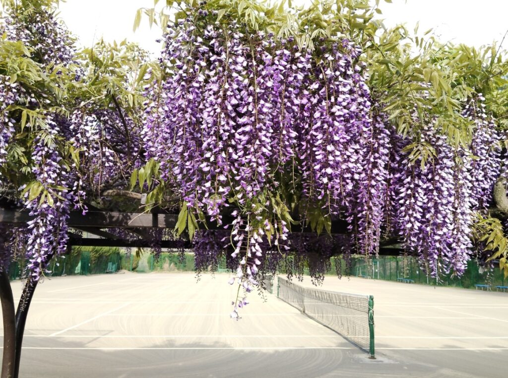 インドアコートでレッスンされる方はご存じないかもしれませんが、実はアウトコートの1番コート横には「藤棚」があるんです(゚д゚)!