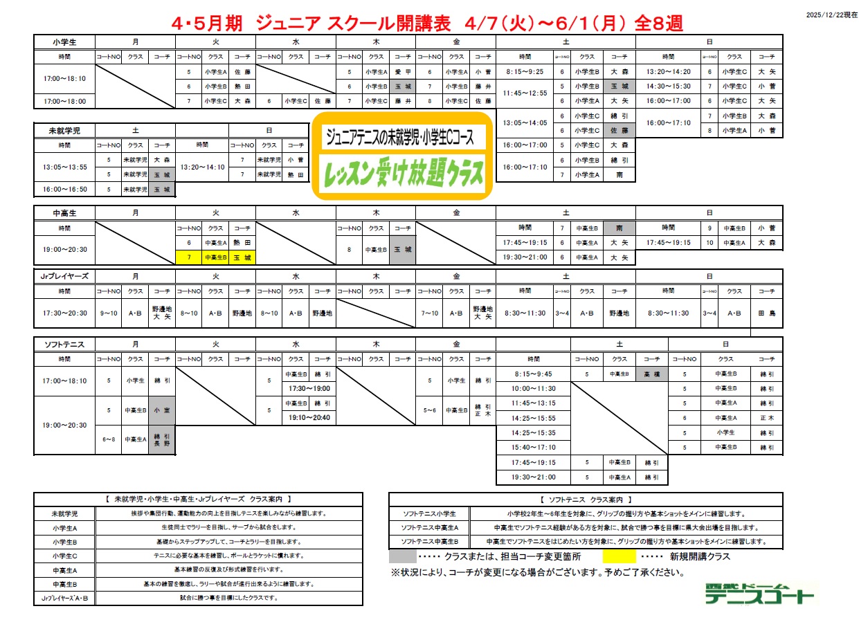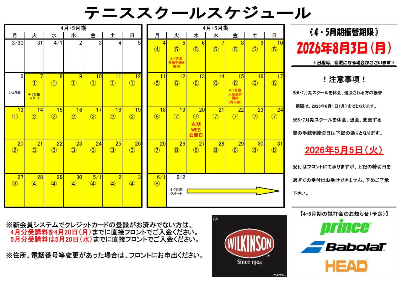 開講表ジュニア&ソフトテニス4月・5月期 2026 4/06 membership 2025-01-142026-04-06 開講表ジュニア&ソフトテニス4月5月期 開講表4月5月期カレンダー membership よかったらシェアしてね! URLをコピーしました! URLをコピーしました! 開講表一般スクール4・5月期 1月11日 シングルストーナメント優勝者 この記事を書いた人 seibu-rec2 関連記事 代行情報 2025-12-26 開講表一般スクール4・5月期 2025-01-14 コメント コメントする コメントをキャンセルコメント ※ 名前 ※ メール ※ サイト 次回のコメントで使用するためブラウザーに自分の名前、メールアドレス、サイトを保存する。