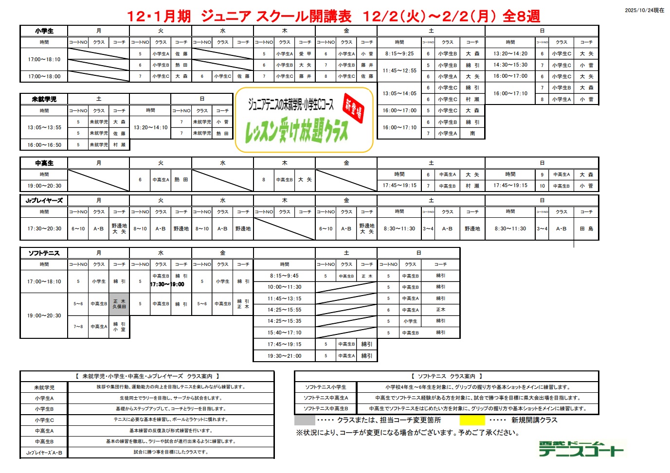 開講表ジュニア&ソフトテニス12月・1月期 2025 11/28 membership 2025-01-142025-11-28 開講表ジュニア&ソフトテニス12月1月期 開講表12月1月期カレンダー membership よかったらシェアしてね! URLをコピーしました! URLをコピーしました! 開講表一般スクール12・1月期 1月11日 シングルストーナメント優勝者 この記事を書いた人 seibu-rec2 関連記事 開講表一般スクール12・1月期 2025-01-14 コメント コメントする コメントをキャンセルコメント ※ 名前 ※ メール ※ サイト 次回のコメントで使用するためブラウザーに自分の名前、メールアドレス、サイトを保存する。