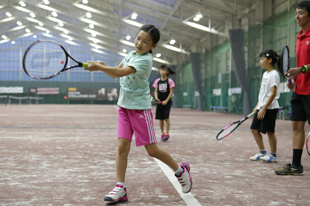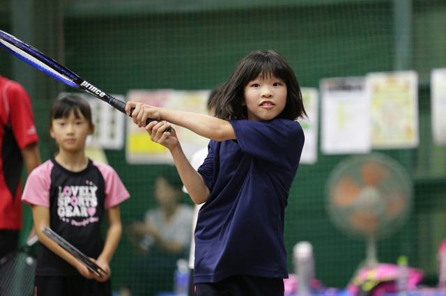 | 小学生B | 小学生Cクラスの進級先です。コートが9ⅿコートに広くなります。 基本指導に加え、動きを伴ったショットやネットプレーの練習を行います。 試合ではシングルスとダブルスの両方を行います。 |